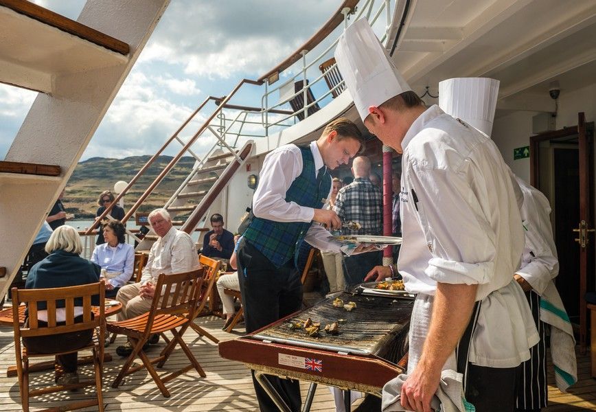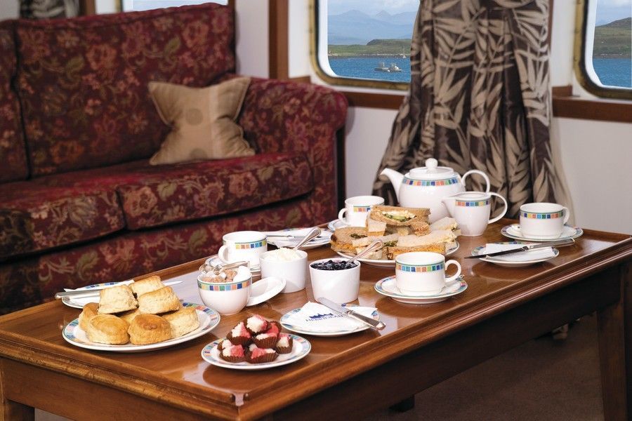 Dining onboard features seasonal Scottish produce, fine wines, and an intimate country-house atmosphere. All meals and drinks are included in the fare.